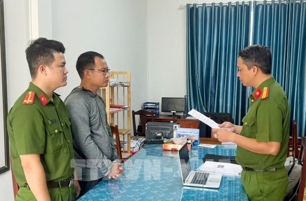 Cơ quan Công an thi hành Lệnh bắt tạm giam đối với Bùi Quang Huy. Ảnh: TTXVN phát