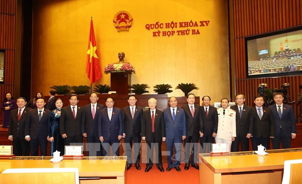 Tổng Bí thư Nguyễn Phú Trọng, Chủ tịch nước Nguyễn Xuân Phúc , Thủ tướng Chính phủ Phạm Minh Chính, Chủ tịch Quốc hội Vương Đình Huệ cùng các đồng chí lãnh đạo Đảng, Nhà nước với Đoàn đại biểu Quốc hội thành phố Cần Thơ. Ảnh: Trí Dũng –TTXVN