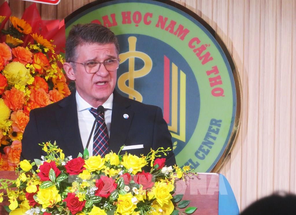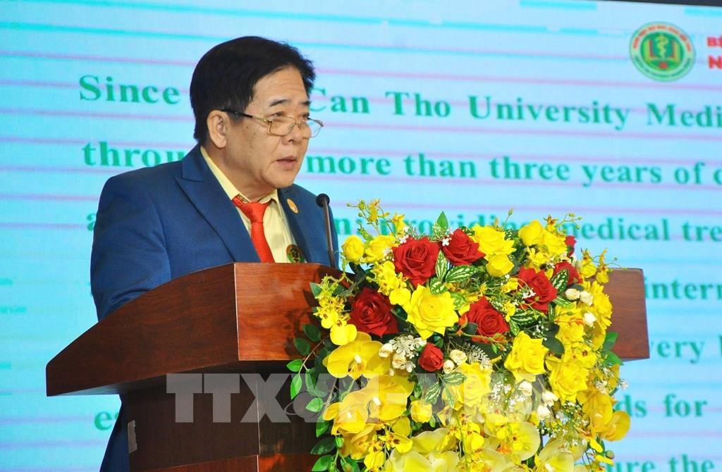 Phó Giáo sư, Tiến sĩ, Bác sĩ Đàm Văn Cương, Giám đốc Bệnh viện Đại học Nam Cần Thơ phát biểu tại buổi lễ. Ảnh: Ánh Tuyết - TTXVN
