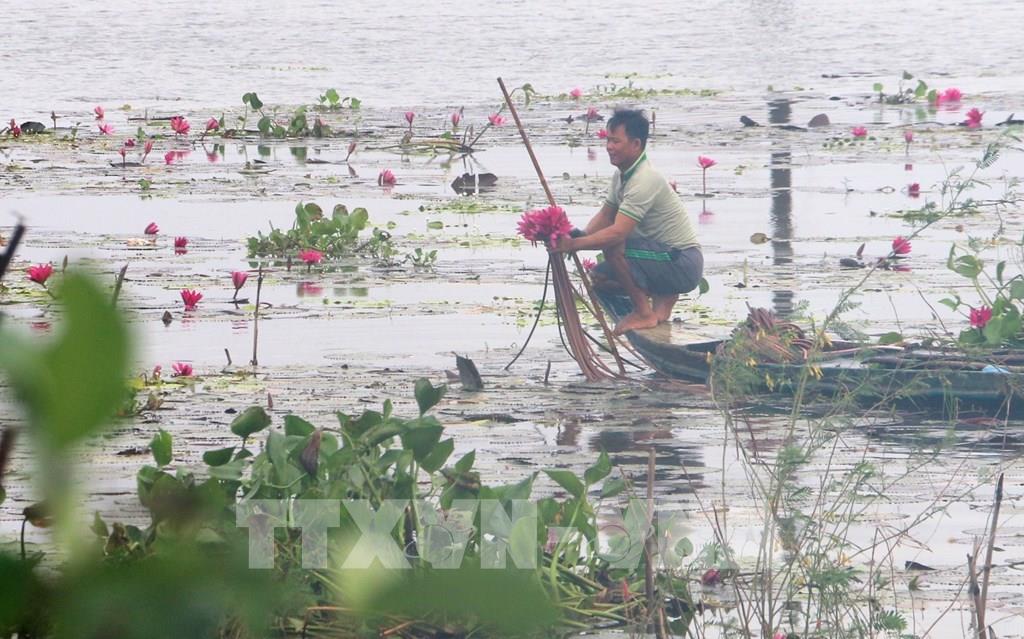 Người dân phường Thới Sơn (tỉnh An Giang) băng đồng hái bông súng "ma" mùa nước nổi. Ảnh: Công Mạo-TTXVN