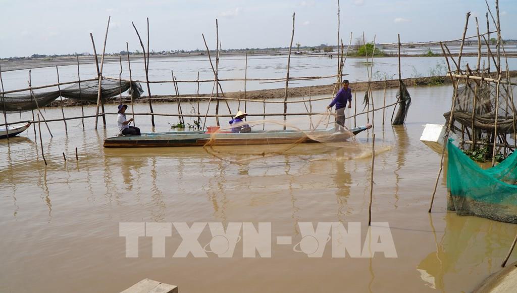 Tổ nuôi trữ cá đồng ấp Giồng Bàng, xã Thường Phước thu hoạch cá bằng cách đặt dớn. Ảnh: Nhựt An - TTXVN