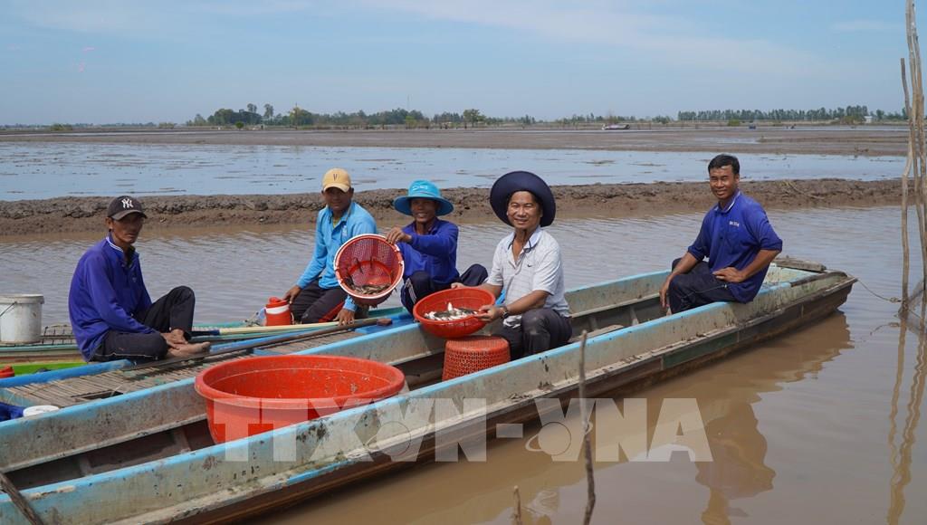 Tổ nuôi trữ cá đồng ấp Giồng Bàng, xã Thường Phước thu hoạch cá. Ảnh: Nhựt An - TTXVN
