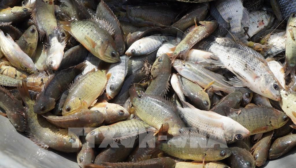 Tổ nuôi trữ cá đồng ấp Giồng Bàng, xã Thường Phước thu hoạch cá dần dần để bán ở các chợ địa phương. Ảnh: Nhựt An - TTXVN