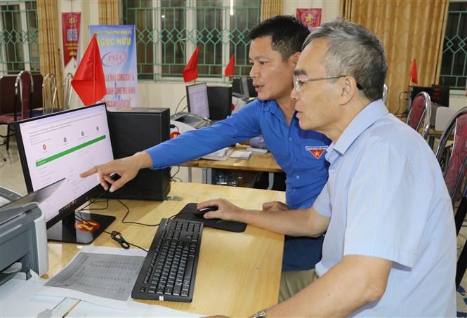 Đoàn viên thanh niên hướng dẫn người dân tại lớp học “Bình dân học vụ số”. Ảnh: Thùy Dung - TTXVN
