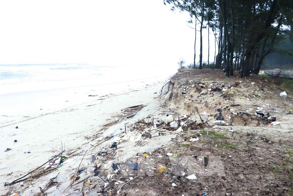 Sóng biển lớn đánh vào bờ bãi tắm Cửa Việt khiến bờ biển bị sạt lở, nhiều gốc phi lao bị trơ rễ. Ảnh: Tường Vi - TTXVN