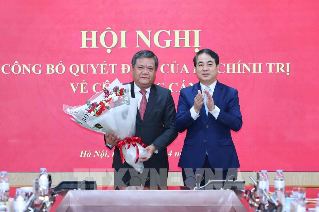 Đồng chí Nghiêm Xuân Thành, Uỷ viên Trung ương Đảng, Phó Chủ nhiệm Uỷ ban Kiểm tra Trung ương tặng hoa chúc mừng đồng chí Trần Phong. Ảnh: Phương Hoa - TTXVN