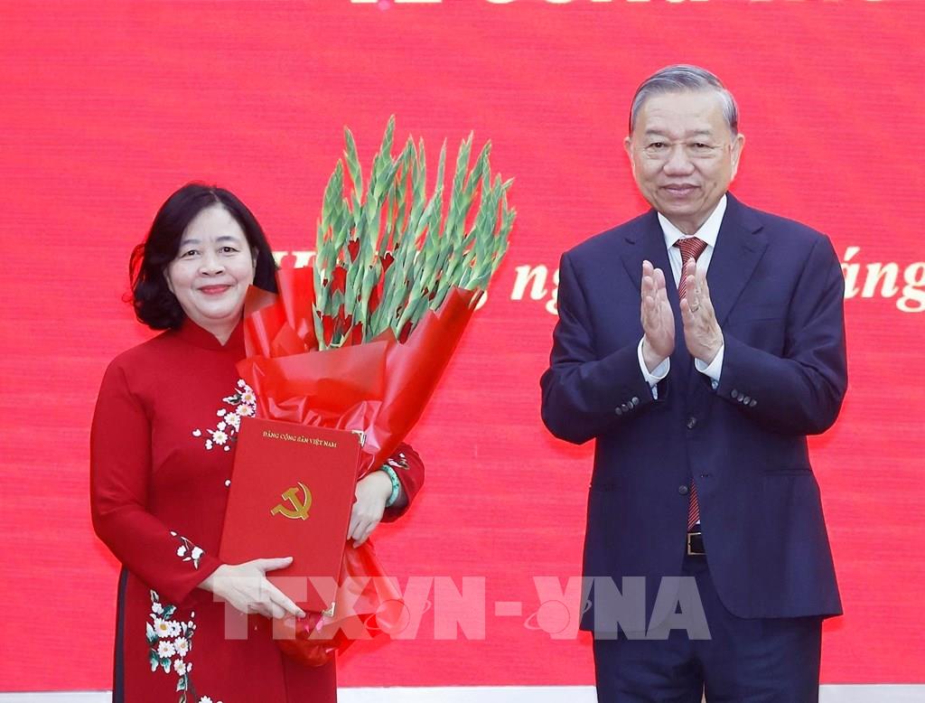 Tổng Bí thư Tô Lâm dự và trao Quyết định của Bộ Chính trị điều động, phân công đồng chí Bùi Thị Minh Hoài giữ chức Bí thư Đảng ủy Mặt trận Tổ quốc, các đoàn thể Trung ương. Ảnh: Thống Nhất - TTXVN