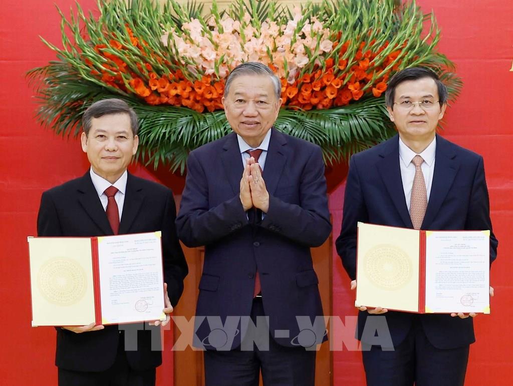 Tổng Bí thư Tô Lâm trao Quyết định của Bộ Chính trị cho các đồng chí Lê Minh Trí (bên trái) và Đoàn Minh Huấn (bên phải). Ảnh: Thống Nhất – TTXVN