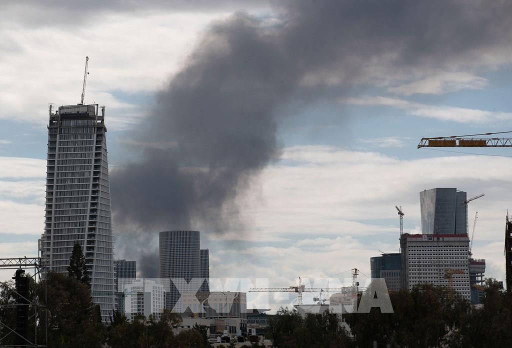 Khói bốc lên từ thành phố Tel Aviv, Israel sau cuộc tấn công đáp trả của Iran ngày 28/2/2026. Ảnh: THX/TTXVN