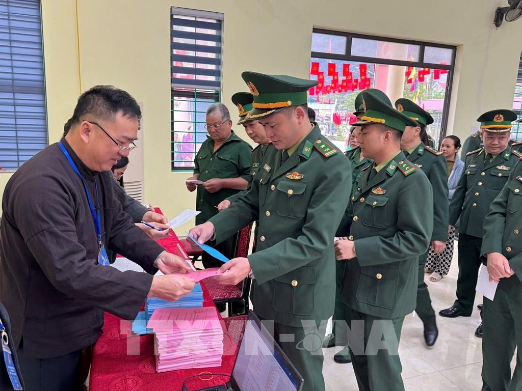 Cán bộ, chiến sỹ Đồn Biên phòng Đàm Thủy, khu vực bỏ phiếu số 9, xóm Đồng Tâm, bản Rạ, bản Mom, xã Đàm Thủy đi bầu cử. Ảnh: Văn Đạt - TTXVN