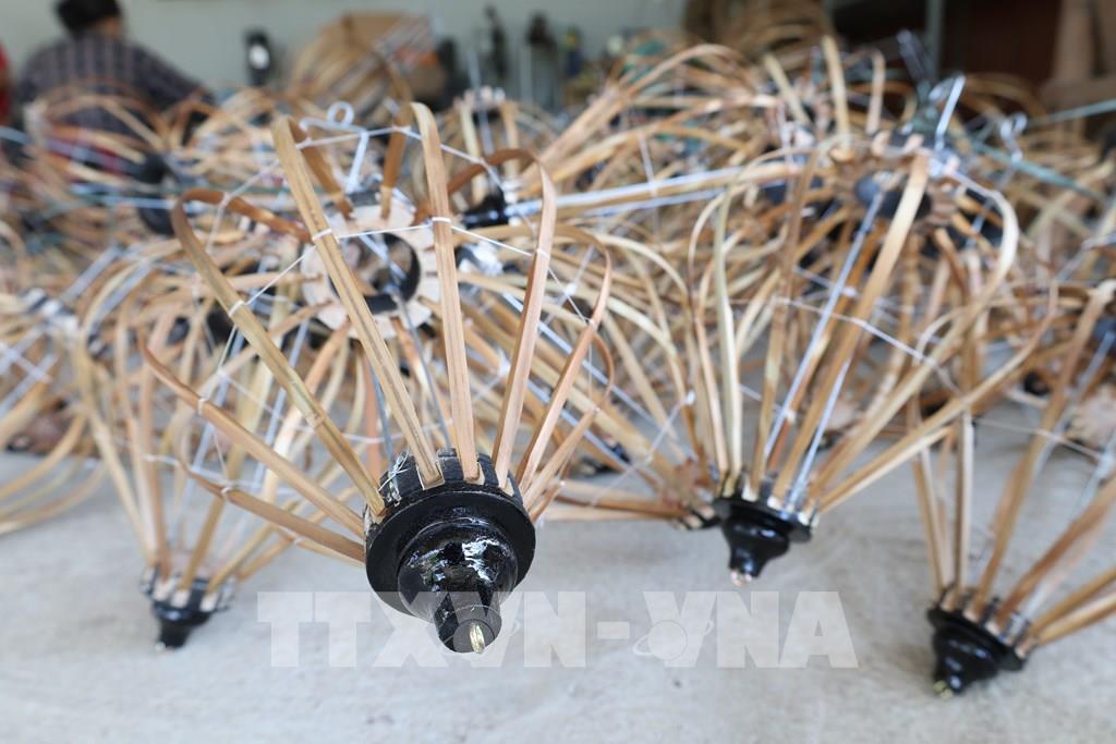 Sản phẩm lồng đèn tại xưởng sản xuất Thiên Đăng (phường Điện Bàn, thành phố Đà Nẵng) được làm hoàn toàn thủ công bằng những vật liệu truyền thống như tre, gỗ và đa dạng về kích cỡ. Ảnh: Khoa Chương - TTXVN