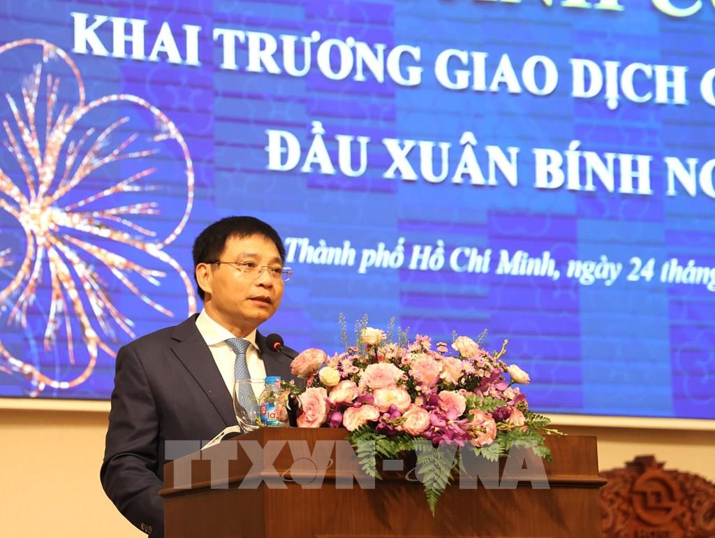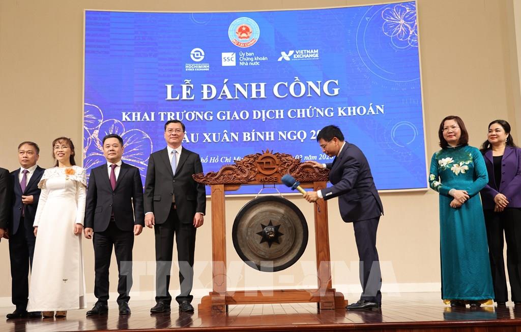 Bộ trưởng Bộ Tài chính Nguyễn Văn Thắng đánh cồng khai phiên giao dịch chứng khoán đầu xuân Bính Ngọ - 2026. Ảnh: Hứa Chung-TTXVN