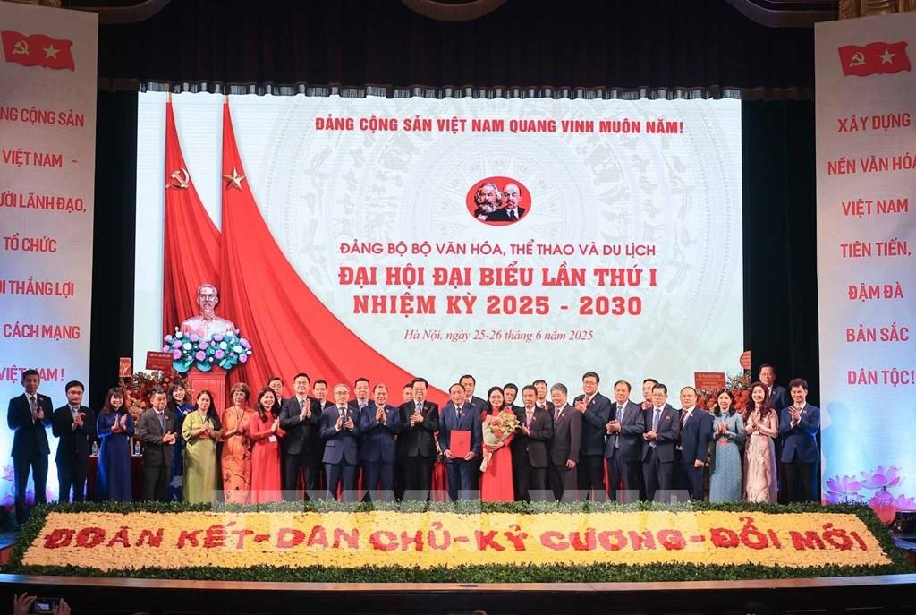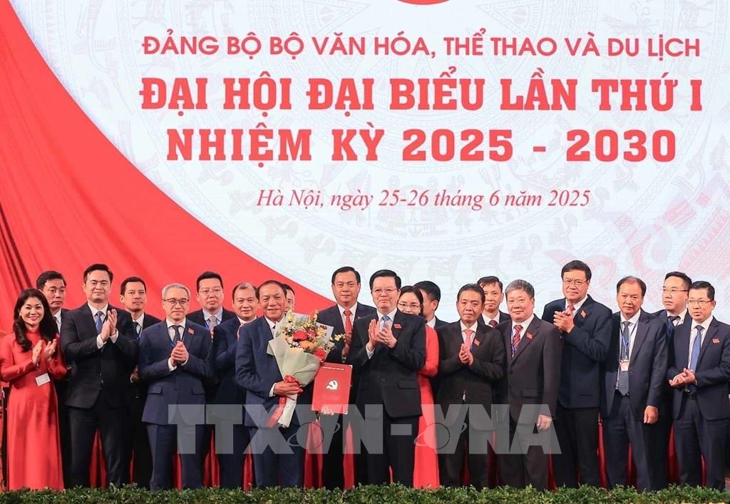 Phó Thủ tướng Mai Văn Chính trao các quyết định chỉ định Ban Chấp hành, Ban Thường vụ, Bí thư, Phó Bí thư Đảng ủy và tặng hoa chúc mừng Ban Chấp hành Đảng bộ Bộ Văn hoá, Thể thao và Du lịch nhiệm kỳ 2025-2030. Ảnh: Hoàng Hiếu - TTXVN