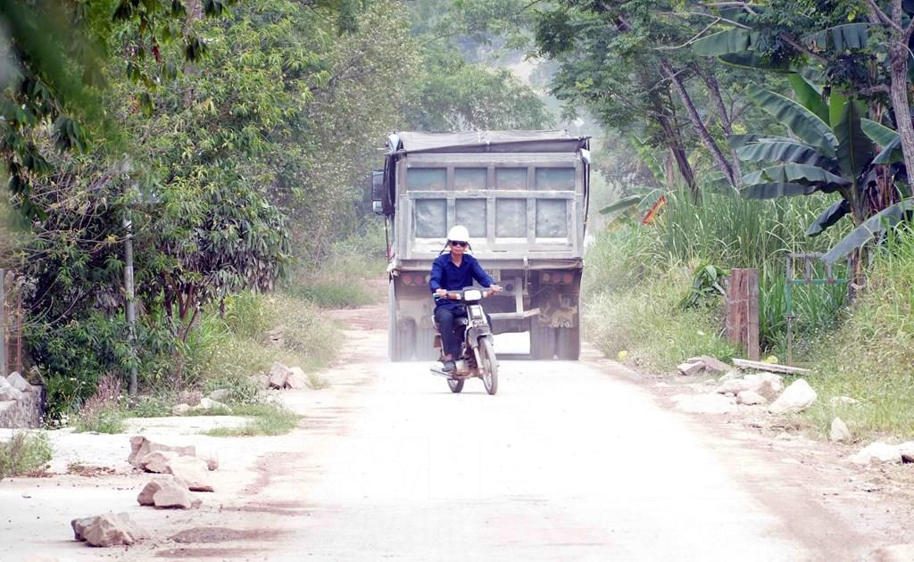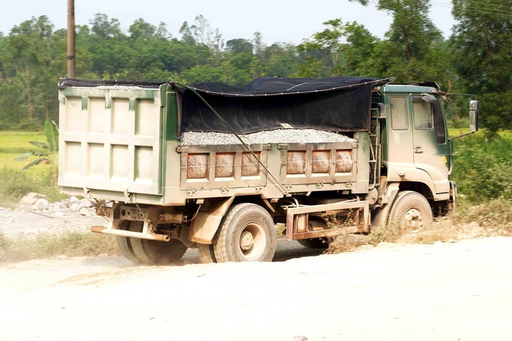 Một xe chở đá đi ra từ hai mỏ đá Minh Cầm và Đại Phúc Sông Gianh nằm trên địa bàn xã Tuyên Bình (Quảng Trị) có dấu hiệu chở vượt thành thùng từ đó gây rơi vãi trên đường và tiềm ẩn nguy cơ mất an toàn giao thông. Ảnh: Tá Chuyên - TTXVN
