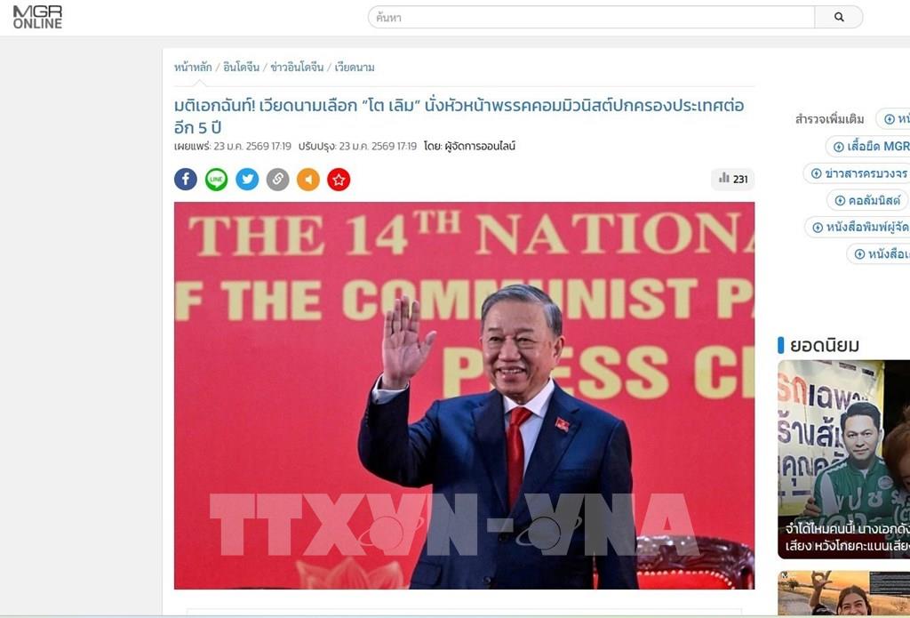 Ngoài ra, nhiều hãng truyền thông lớn khác của Thái Lan cũng đưa tin về Đại hội XIV của Đảng Cộng sản Việt Nam. Trang thairath.co.th ngày 20/1 đăng bài “Tổng Bí thư Tô Lâm tuyên bố mục tiêu tăng trưởng GDP 10% mỗi năm cho Việt Nam”. Trang mạng pptvhd36.com ngày 20/1 cũng có bài “Việt Nam đặt mục tiêu tăng trưởng kinh tế 10% mỗi năm đến năm 2030”. Trang mạng dailynews.co.th ngày 23/1 đăng bài “Đảng Cộng sản Việt Nam nhất trí bầu đồng chí Tô Lâm làm Tổng Bí thư thêm 5 năm”; và bangkokpost.com (23/1) đăng bài “Các nhà đầu tư hoan nghênh cải cách kinh tế của Việt Nam khi Tổng Bí thư Tô Lâm được tái bổ nhiệm”.