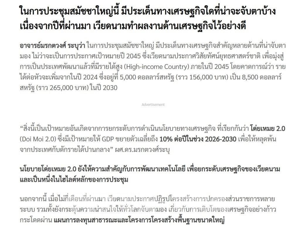 Trong khi đó, báo Prachachat Business số ra ngày 23/1 đăng bài phỏng vấn Phó Giáo sư, Tiến sĩ Morakotwong Phumiphlub – giảng viên Nghiên cứu châu Á, Khoa Nhân văn, Đại học Thammasat, chuyên gia về Việt Nam – xoay quanh các vấn đề kinh tế trọng điểm tại Đại hội XIV, đồng thời so sánh điểm mạnh, điểm yếu trong phát triển kinh tế giữa Việt Nam và Thái Lan.
