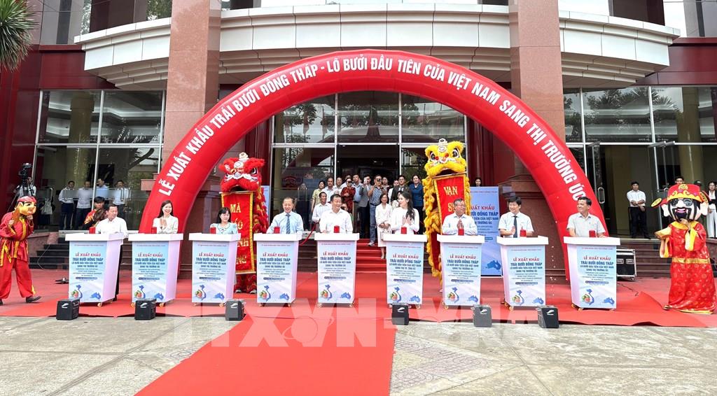 Các đại biểu nhấn nút khởi động lô bưởi đầu tiên được xuất sang thị trường Australia. Ảnh: Hồng Nhung - TTXVN