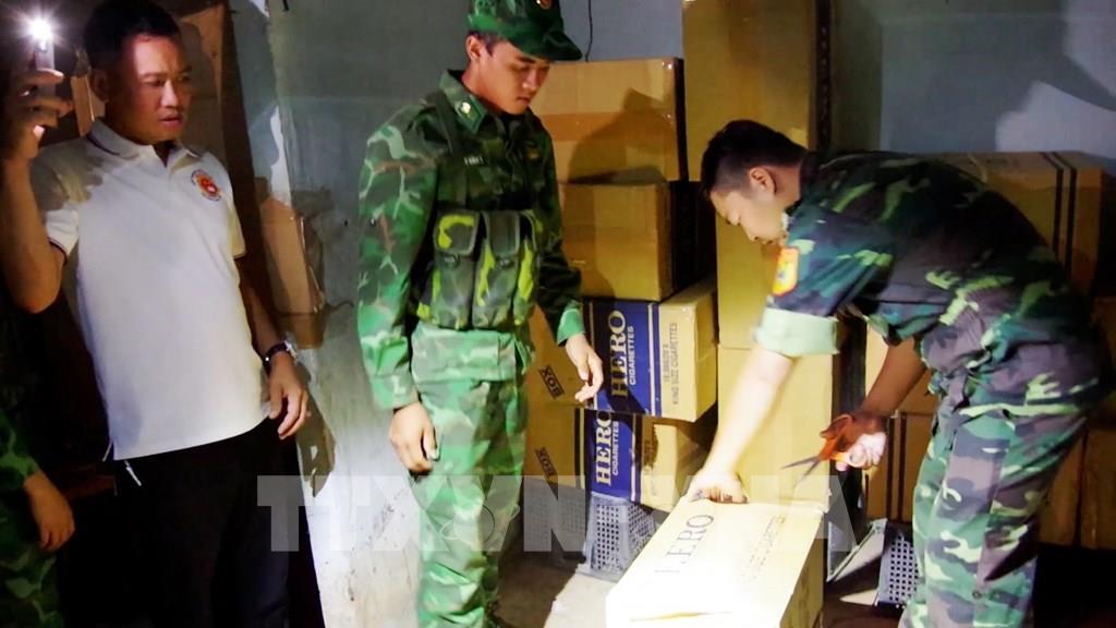 Lực lượng chức năng thu giữ số lượng lớn thuốc lá ngoại nhập lậu. Ảnh: TTXVN phát