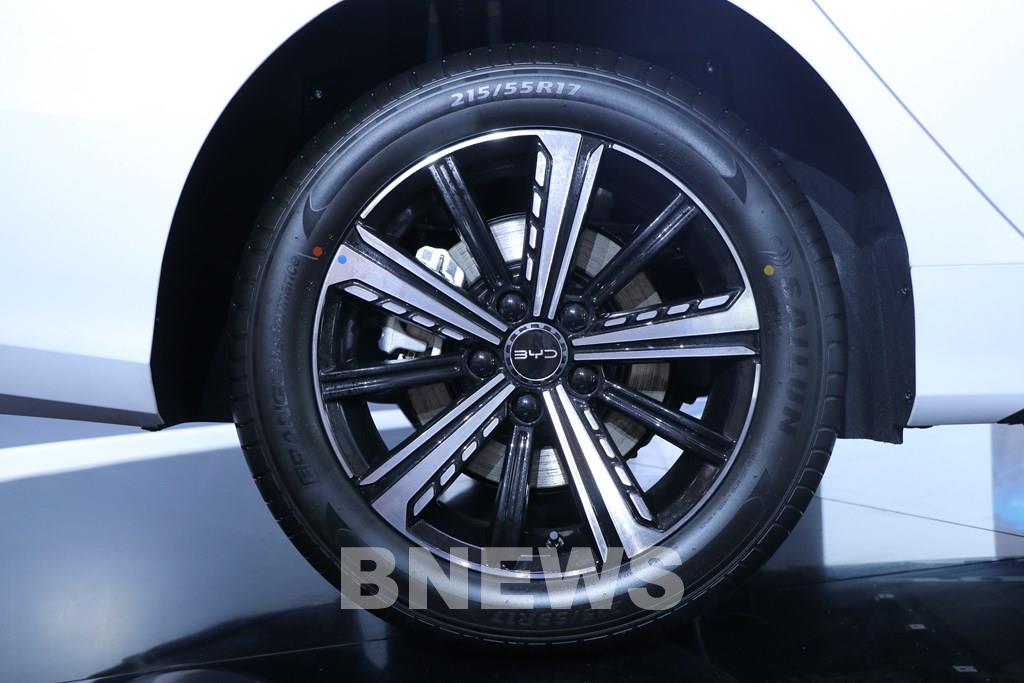 BYD SEAL 5 được trang bị bộ mâm hợp kim 17 inch phay xước hai màu tôn thêm vẻ thể thao và chắc chắn, đồng thời hỗ trợ tối ưu khả năng vận hành. Ảnh: Văn Xuyên/BNEWS/TTXVN