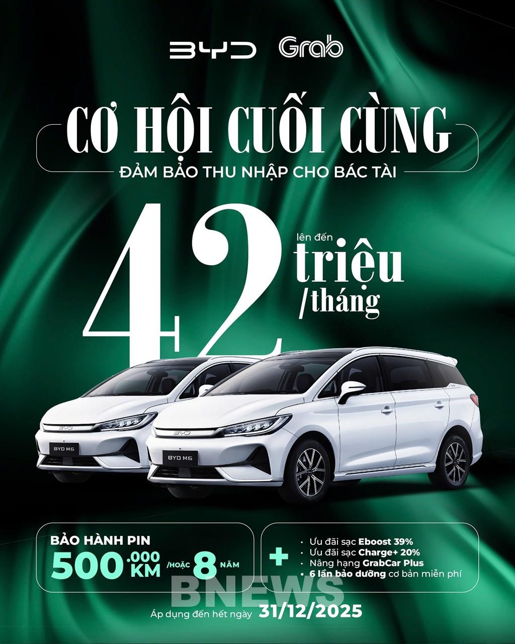 BYD Việt Nam cùng Grab công bố chính sách hỗ trợ tài xế đảm bảo thu nhập đến 42 triệu đồng trên kỳ, ưu đãi sạc Eboost 39% và Charge+ 20%, cùng cơ hội nâng hạng GrabCar Plus
