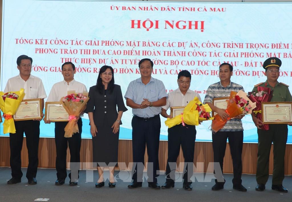 Phó Bí thư Thường trực Tỉnh ủy Huỳnh Quốc Việt trao bằng khen của Chủ tịch UBND tỉnh cho tập thể có thành tích xuất sắc trong công tác giải phóng mặt bằng dự án. Ảnh: Tuấn Phi - TTXVN