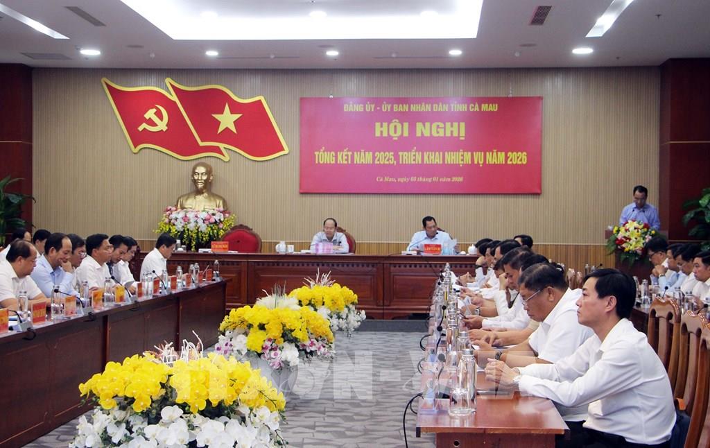 Phát biểu chỉ đạo tại hội nghị, ông Nguyễn Hồ Hải, Bí thư Tỉnh ủy Cà Mau đánh giá cao những nỗ lực của Đảng ủy UBND tỉnh với nhiều thành tựu đáng tự hào về những kết quả đã đạt được trong một bối cảnh đầy biến động và thách thức. Đó là, sự ổn định và thông suốt sau hợp nhất; Cà Mau đã hoàn thành việc sáp nhập Đảng bộ và bộ máy chính quyền của hai tỉnh Cà Mau và Bạc Liêu cũ mà không để xảy ra bất kỳ sự gián đoạn nào trong điều hành. Việc chuyển đổi sang mô hình chính quyền địa phương 2 cấp tuy vẫn còn một số khó khăn nhất định nhưng đã bước đầu phát huy hiệu quả; kinh tế duy trì đà tăng trưởng. Đặc biệt, kim ngạch xuất khẩu tôm tiếp tục khẳng định vị thế dẫn đầu cả nước. Dấu ấn về hạ tầng và kinh tế biển trong năm 2025 ghi nhận sự chuyển biến mạnh mẽ trong triển khai, thực hiện các công trình trọng điểm. Việc hoàn thiện các thủ tục và đẩy nhanh tiến độ các dự án giao thông kết nối, các khu kinh tế ven biển và đặc biệt là năng lượng tái tạo (điện gió, điện mặt trời) đã mở ra không gian phát triển mới, đưa Cà Mau tiến gần hơn tới mục tiêu trở thành trung tâm năng lượng sạch của khu vực. Cà Mau cũng đã đạt được bước tiến mạnh mẽ trong chuyển đổi số, như thực hiện thu nhận hàng trăm ngàn hồ sơ cấp căn cước, kích hoạt tài khoản định danh điện tử và tích hợp Sổ sức khỏe điện tử trên VNeID cho đại đa số người dân. Đây không chỉ là những con số, mà là minh chứng cho sự nỗ lực xây dựng một chính quyền phục vụ, lấy người dân làm trung tâm.Tại hội nghị, nhiều ý kiến thảo luận của các sở, ngành, địa phương nhằm đưa ra những giải pháp phấn đấu đạt hiệu quả kinh tế cao nhất trong thực hiện kế hoạch tăng trưởng kinh tế của tỉnh đạt trên 10% trong năm 2026.