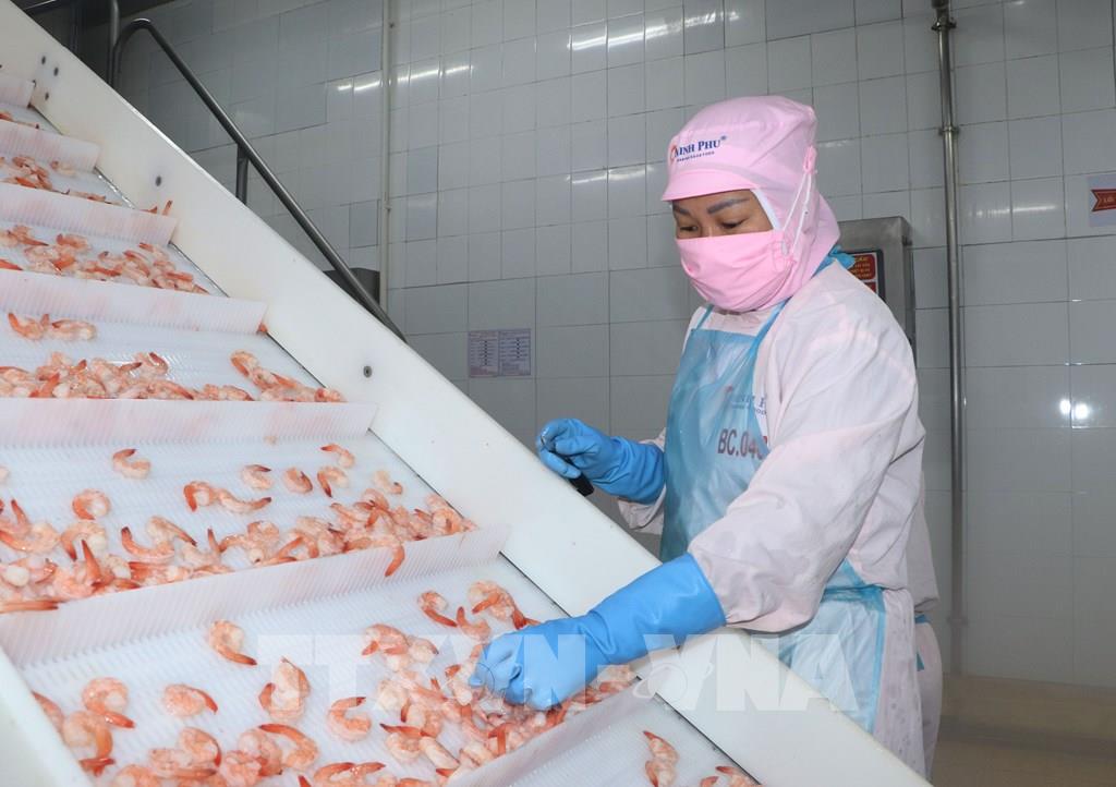 Ứng dụng công nghệ trong sản xuất chế biến tôm tại Tập đoàn thủy sản Minh Phú. Ảnh: Tuấn Phi - TTXVN
