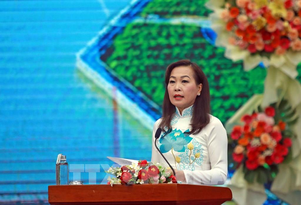 Chủ tịch Hội Doanh nhân trẻ tỉnh Cà Mau Hồ Lệ Quyên phát biểu tại hội nghị. Ảnh: Huỳnh Anh - TTXVN