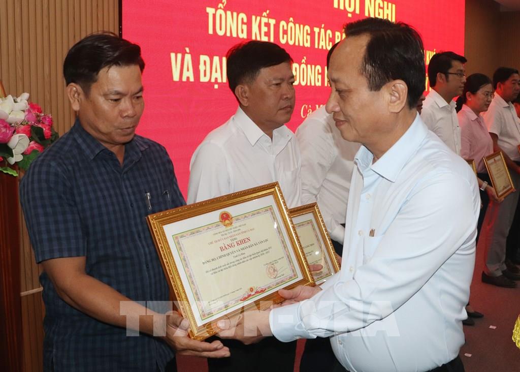 Bí thư Tỉnh ủy Cà Mau Nguyễn Hồ Hải trao tặng Bằng khen của Chủ tịch UBND tỉnh cho các tập thể có thành tích xuất sắc. Ảnh: Tuấn Phi - TTXVN