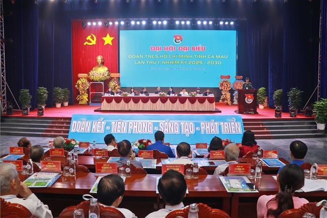 Đại hội xác định khẩu hiệu hành động “Đoàn kết - Tiên phong - Sáng tạo - Phát triển” như một lời hiệu triệu và cam kết chính trị của tuổi trẻ Cà Mau. Ảnh: Huỳnh Anh - TTXVN