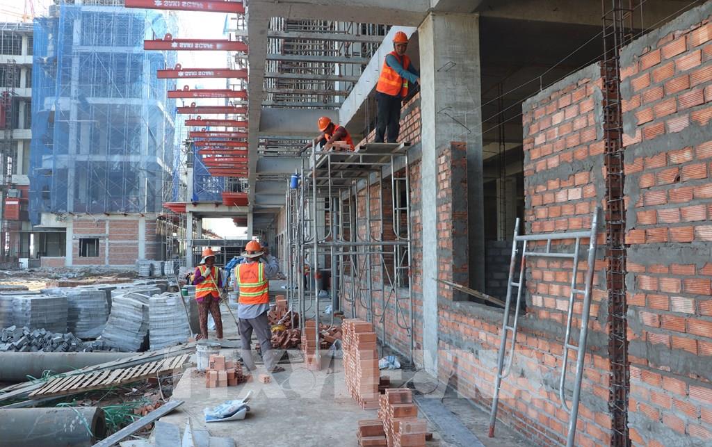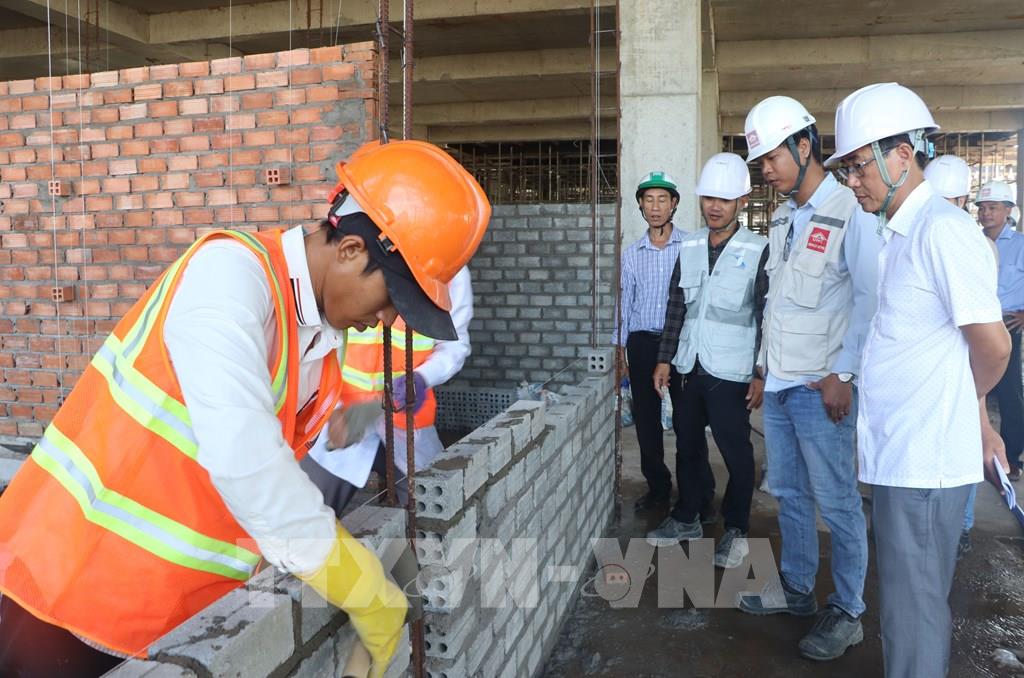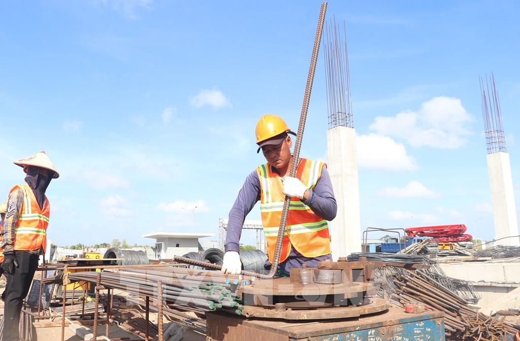 Công nhân triển khai thi công hạng mục xây lắp tại gói thầu số 27 của dự án Bệnh viện Đa khoa tỉnh Cà Mau. Ảnh: Tuấn Phi - TTXVN