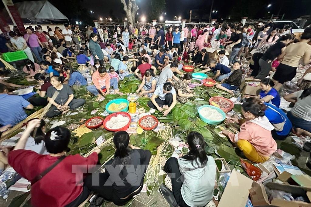Hàng trăm người dân gói bánh trong đêm tại phường Trảng Dài, tỉnh Đồng Nai để gửi đến người dân vùng lũ. Ảnh: Lê Xuân-TTXVN