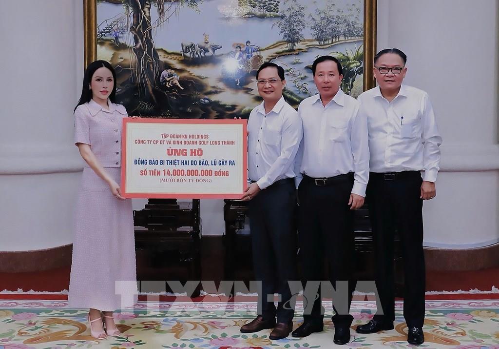 Bà Lê Nữ Thùy Dương, Chủ tịch kiêm Tổng giám đốc Tập đoàn KN Holdings đã trao bảng tượng trưng, thông qua tỉnh Đồng Nai ủng hộ đồng bào bị thiệt hại do bão, lũ gây ra. Ảnh: Lê Xuân-TTXVN