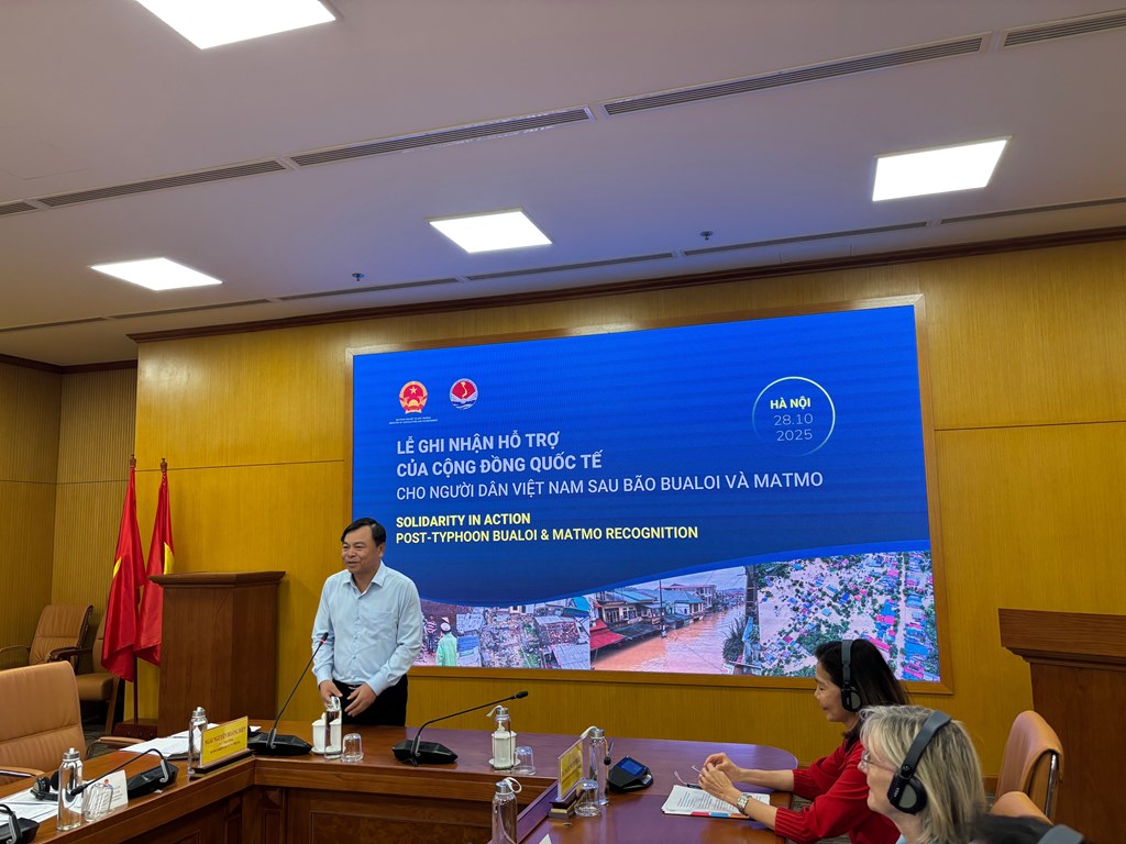 Phát biểu tại buổi lễ, Thứ trưởng Bộ Nông nghiệp và Môi trường Nguyễn Hoàng Hiệp chia sẻ, Bộ Nông nghiệp và Môi trường đánh giá cao những đóng góp thiết thực về vật chất và tinh thần mà các Đại Sứ quân, các tổ chức quốc tế... đã dành cho các cộng đồng bị ảnh hưởng hai cơn bão số 11 và bão số 12. Sự hỗ trợ này không chỉ giúp đáp ứng nhu cầu cứu trợ khẩn cấp mà còn góp phần quan trọng trong công tác khắc phục hậu quả và phục hồi sau thiên tai. Bộ Nông nghiệp và Môi trường tin rằng, bên cạnh cứu trợ khẩn cấp, việc chuẩn bị trước và tăng cường khả năng chống chịu với thiên tai là yếu tố không kém phần quan trọng để bảo vệ cuộc sống và sinh kế của người dân một cách bền vững.