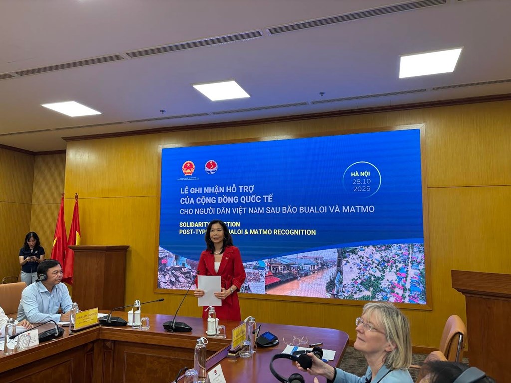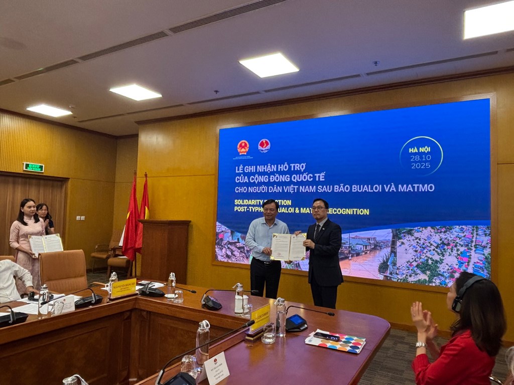 Sáng 28/10, Đối tác Giảm nhẹ rủi ro thiên tai, Bộ Nông nghiệp và Môi trường tổ chức Lễ ghi nhận hỗ trợ của cộng đồng quốc tế dành cho Việt Nam sau bão số 10 (BUALOI) và bão số 11 (MATMO). Chủ tịch Đối tác Giảm nhẹ rủi ro thiên tai, Thứ trưởng Bộ Nông nghiệp và Môi trường Nguyễn Hoàng Hiệp và bà Pauline Tamesis, đồng Chủ tịch Đối tác Giảm nhẹ rủi ro thiên tai, Điều phối viên thường trú Liên hợp quốc tại Việt Nam đồng chủ trì buổi lễ.