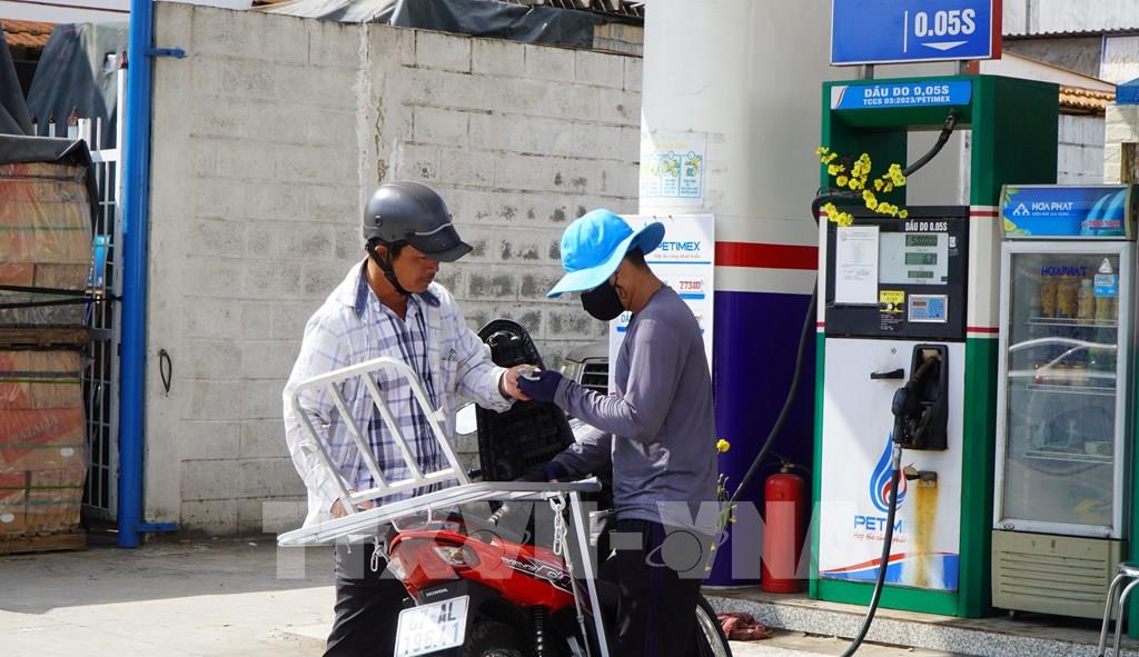 Người đi xe gắn máy mua xăng tại Cửa hàng xăng dầu Hòa Đông 2 (xã Mỹ Thọ, tỉnh Đồng Tháp). Ảnh: Nhựt An - TTXVN