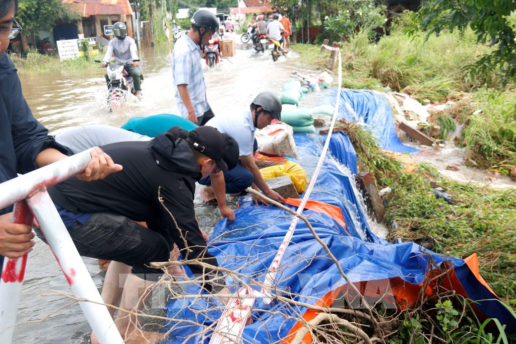 Lực lượng chức năng sử dụng bạt và bao cát để ngăn sạt lở tuyến đường ga Mương Mán do bị ngập sâu. Ảnh: Nguyễn Thanh - TTXVN