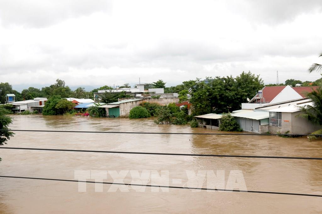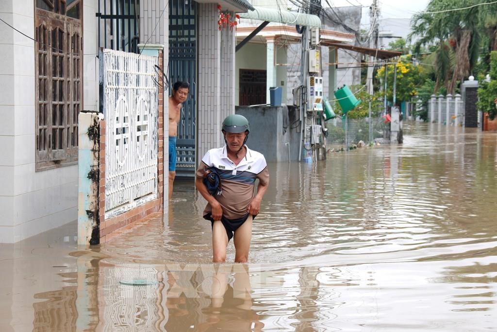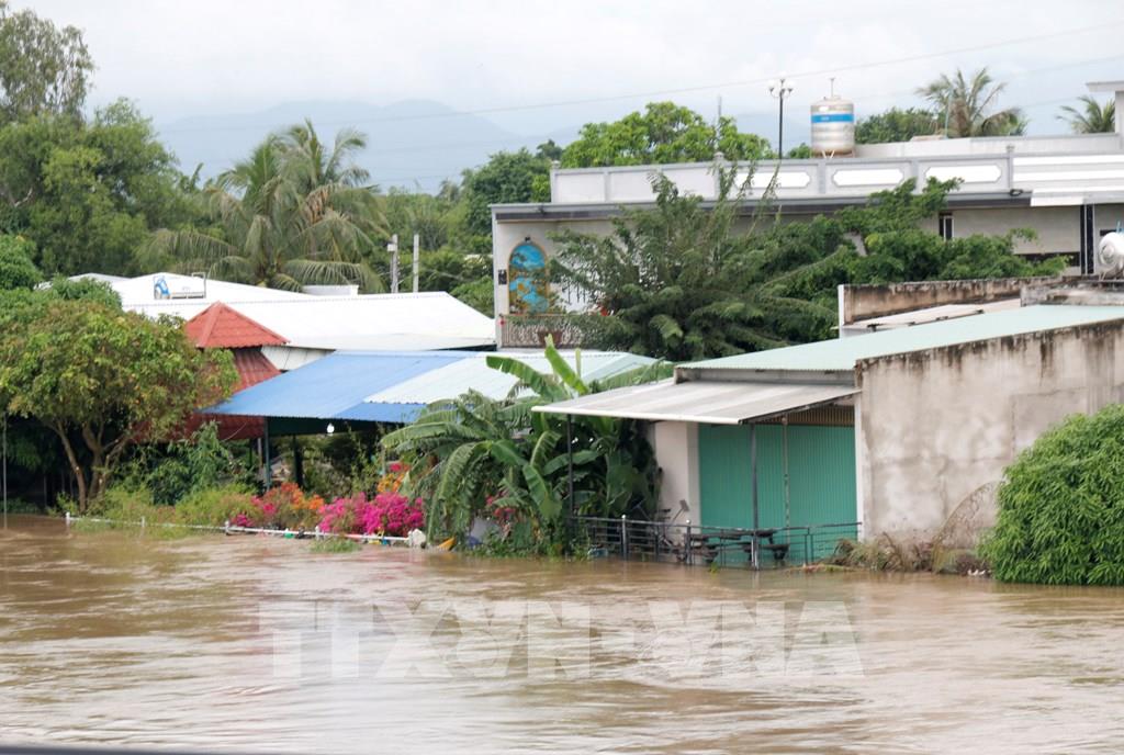 Nhiều nhà dân ven sông Phú Hài, phường Hàm Thắng bị ngập sâu trong nước phải di dời đến nơi ở khác. Ảnh: Nguyễn Thanh - TTXVN