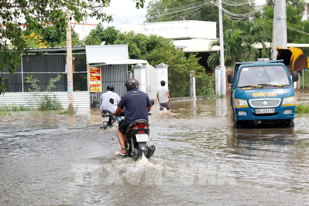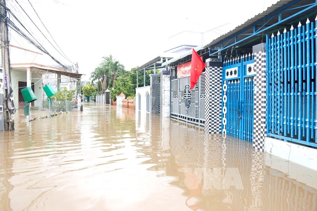 Nhiều tuyến đường trung tâm tại phường Bình Thuận vẫn ngập sâu trong nước, người dân đi lại khó khăn. Ảnh: