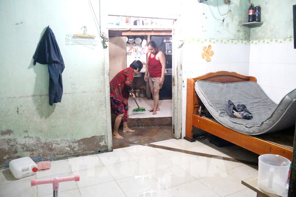 Người dân phường Bình Thuận lau dọn nhà cửa ngay khi nước có dấu hiệu rút. Ảnh: Nguyễn Thanh - TTXVN
