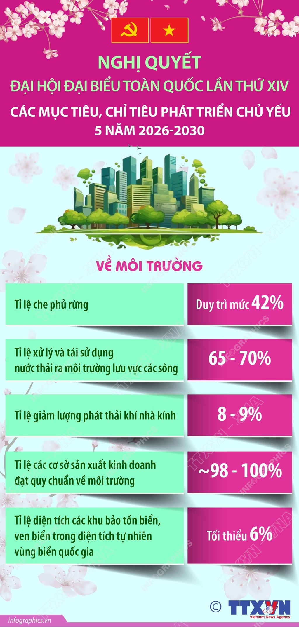 Trong đó các mục tiêu, chỉ tiêu môi trường là: Tỉ lệ che phủ rừng duy trì mức 42%; tỉ lệ xử lý và tái sử dụng nước thải ra môi trường lưu vực các sông đạt 65 - 70%; lượng phát thải khí nhà kính giảm 8 - 9%; tỉ lệ các cơ sở sản xuất kinh doanh đạt quy chuẩn về môi trường đạt khoảng 98 - 100%; tăng diện tích các khu bảo tồn biển, ven biển đạt tối thiểu 6% diện tích tự nhiên vùng biển quốc gia.