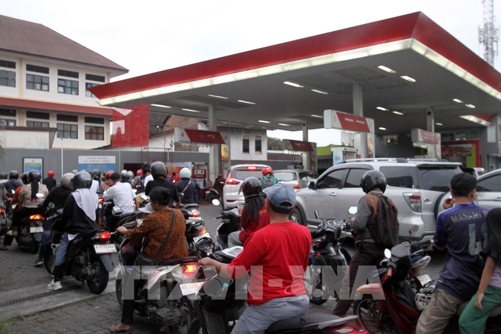 Người dân xếp hàng chờ mua xăng tại một trạm xăng ở Surakarta, Trung Java, Indonesia. Ảnh: THX/TTXVN