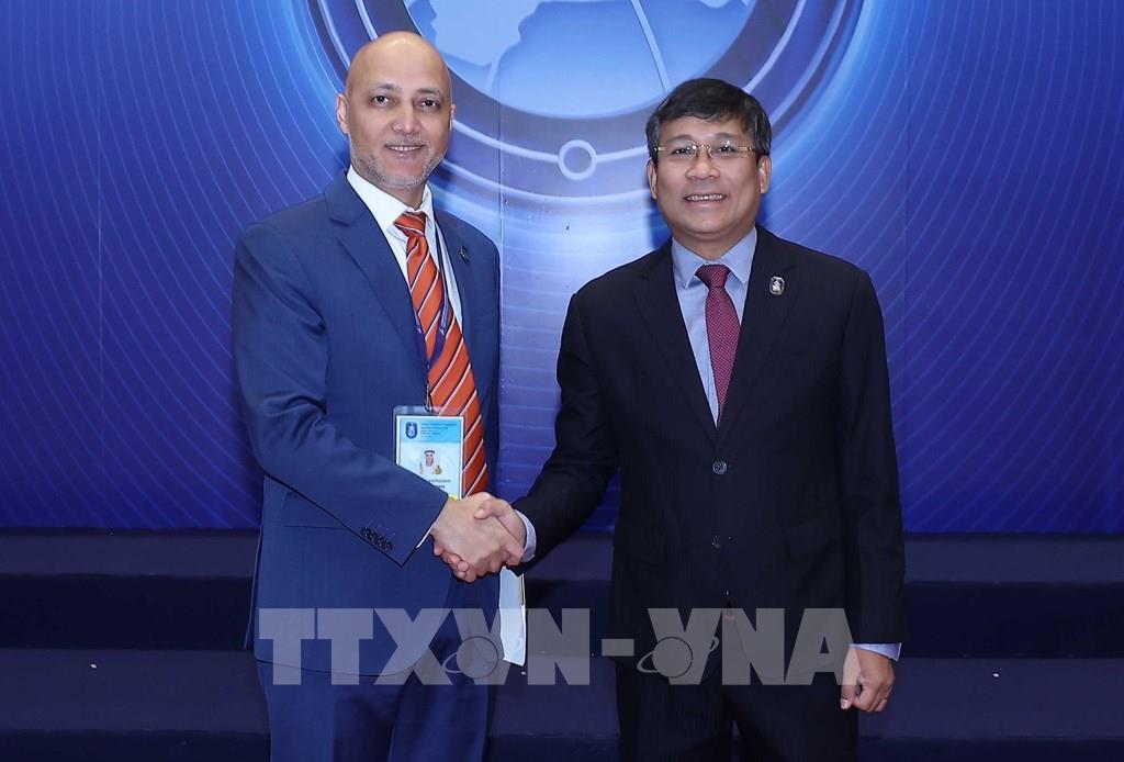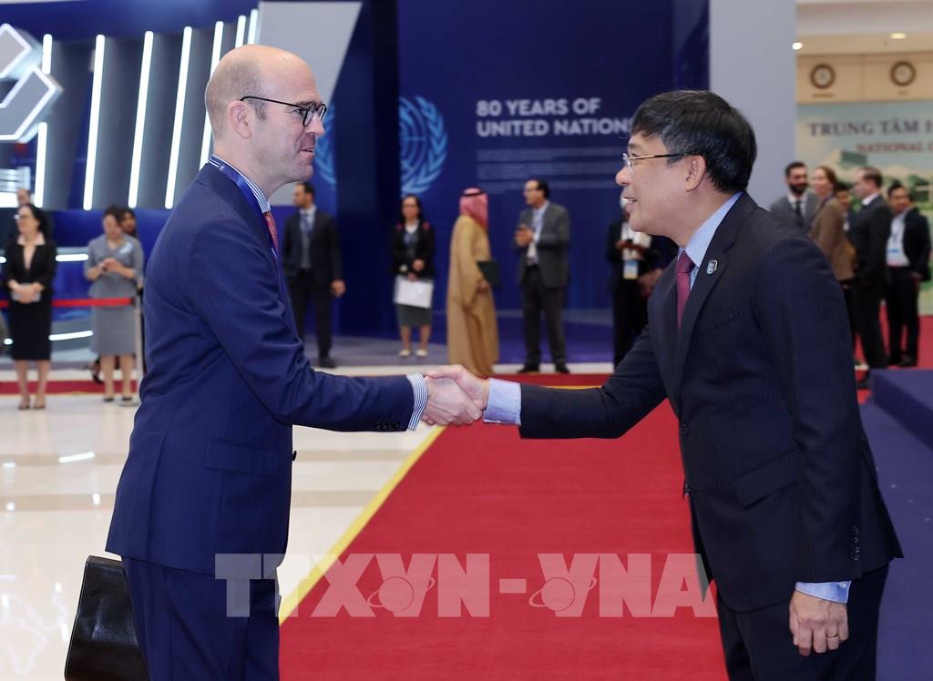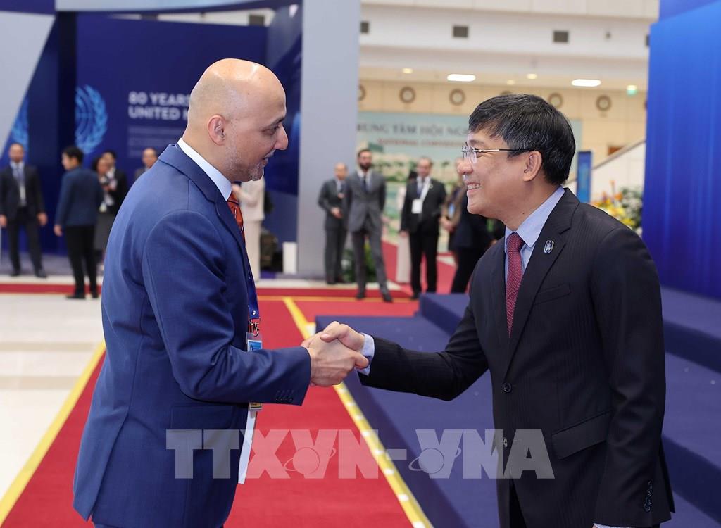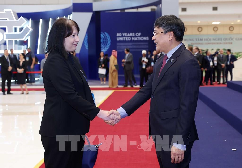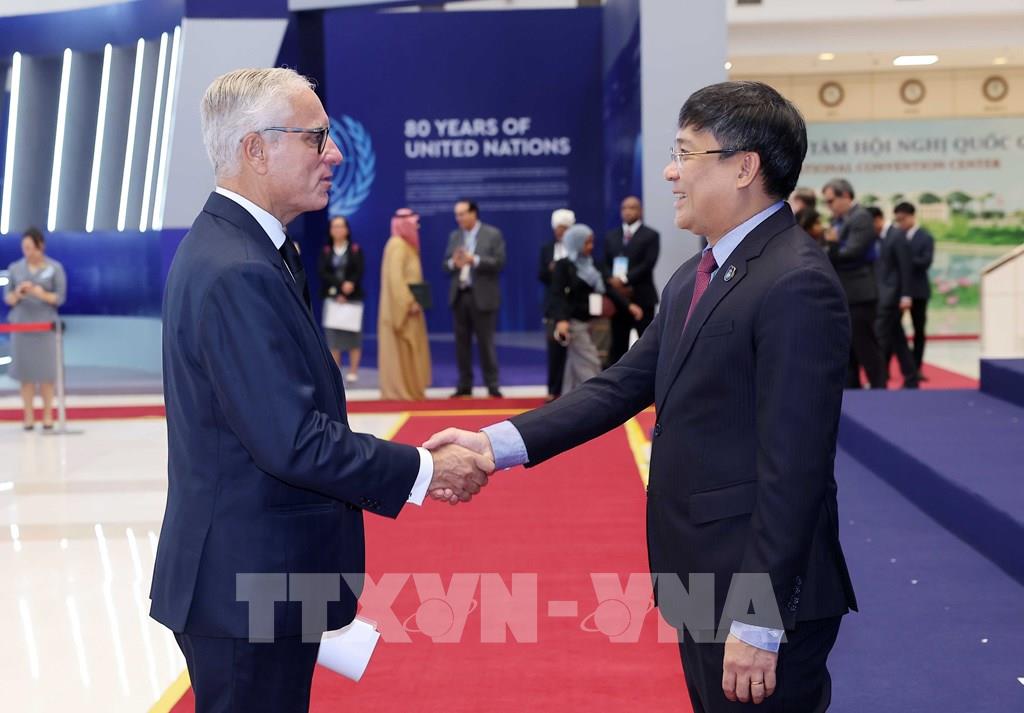 Thứ trưởng Thường trực Bộ Ngoại giao Nguyễn Minh Vũ với các đại biểu tham dự Lễ mở ký Công ước Hà Nội, sáng 25/10. Ảnh: An Đăng-TTXVN