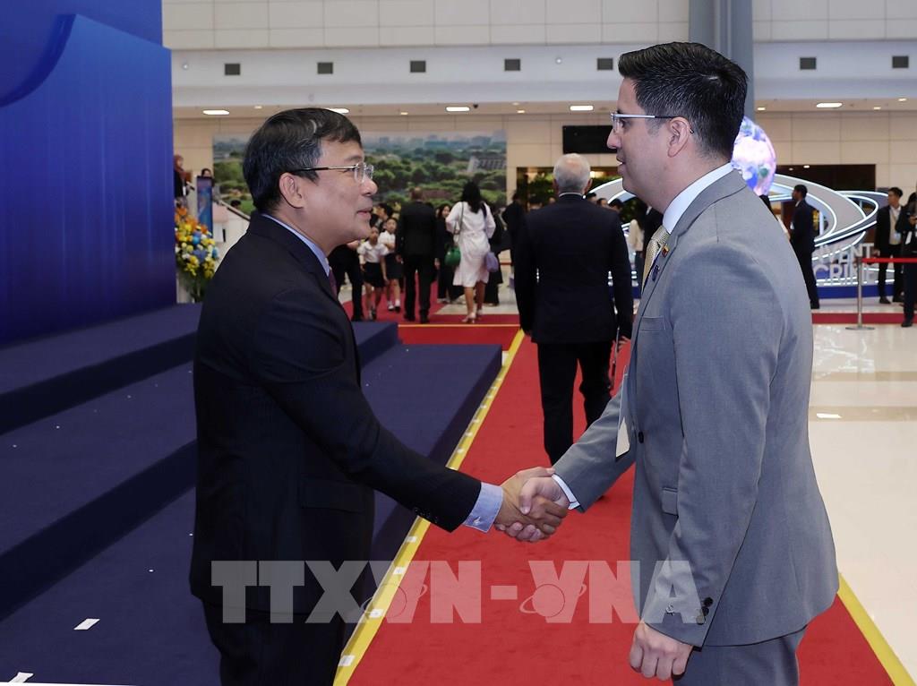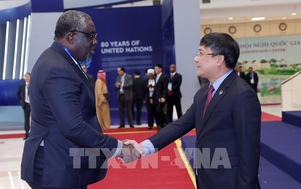 Thứ trưởng Thường trực Bộ Ngoại giao Nguyễn Minh Vũ đón các Trưởng đoàn dự Lễ mở ký Công ước Hà Nội, sáng 25/10. Ảnh: TTXVN