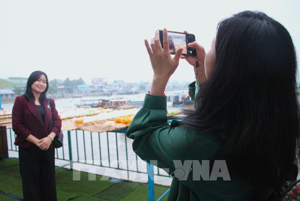 Du khách check-in tại Chợ nổi Cái Răng. Ảnh: Nguyễn Hằng - TTXVN