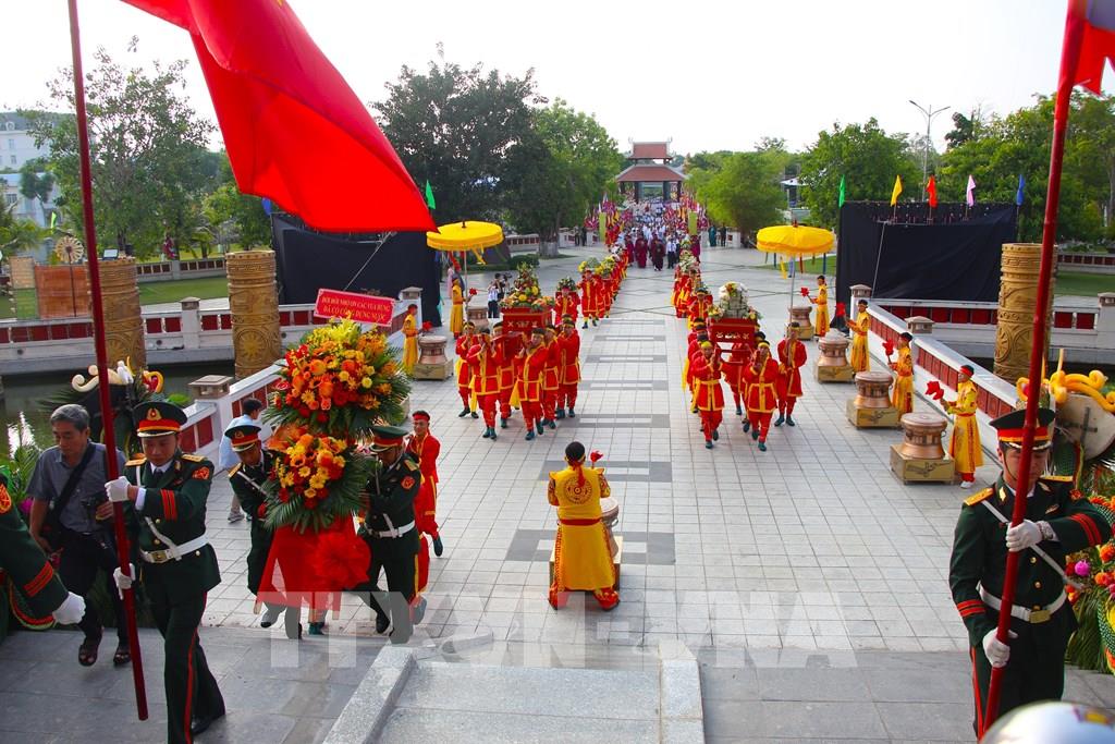 Đoàn dâng lễ phẩm tiến vào sân lễ. Ảnh: Nguyễn Hằng - TTXVN