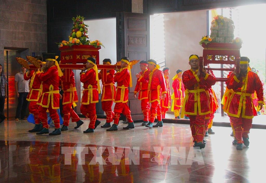 Đoàn dâng lễ phẩm tiến vào đền thờ. Ảnh: Nguyễn Hằng - TTXVN