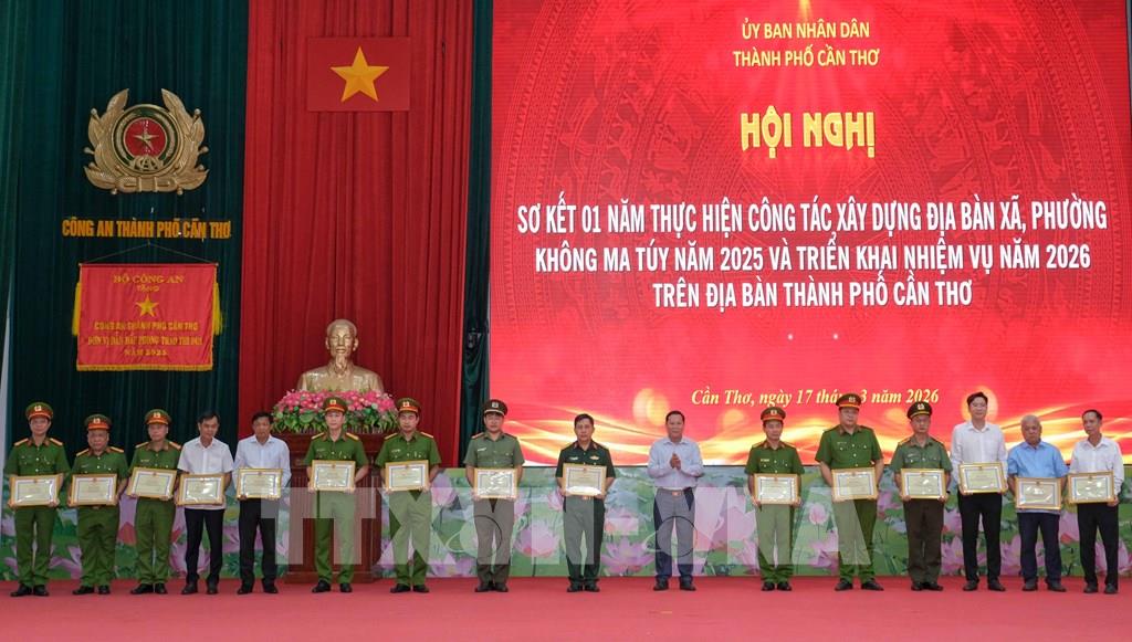 Trao Bằng khen của Chủ tịch UBND thành phố Cần Thơ cho các cá nhân có thành tích xuất sắc trong xây dựng xã, phường không có ma túy năm 2025. Ảnh: Thanh Liêm - TTXVN