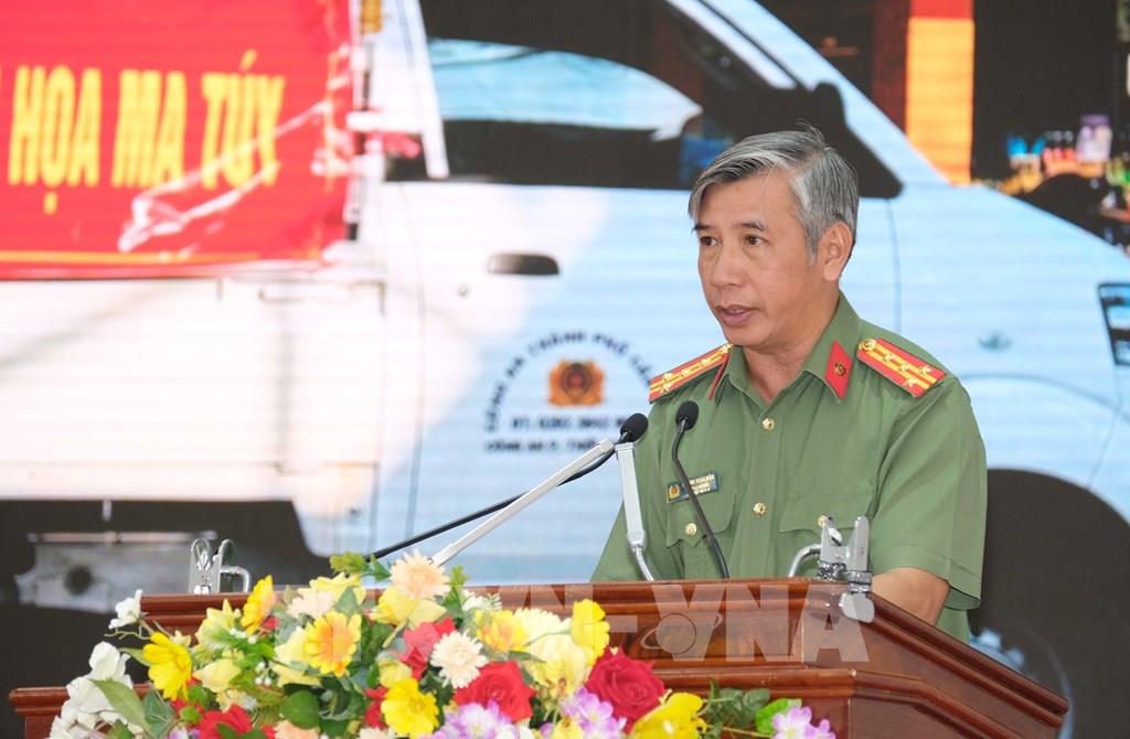Đại tá Huỳnh Hoài Hận, Phó Giám đốc Công an thành phố Cần Thơ, báo cáo kết quả 1 năm thực hiện xây dựng xã, phường không có ma túy tại Hội nghị. Ảnh: Thanh Liêm - TTXVN