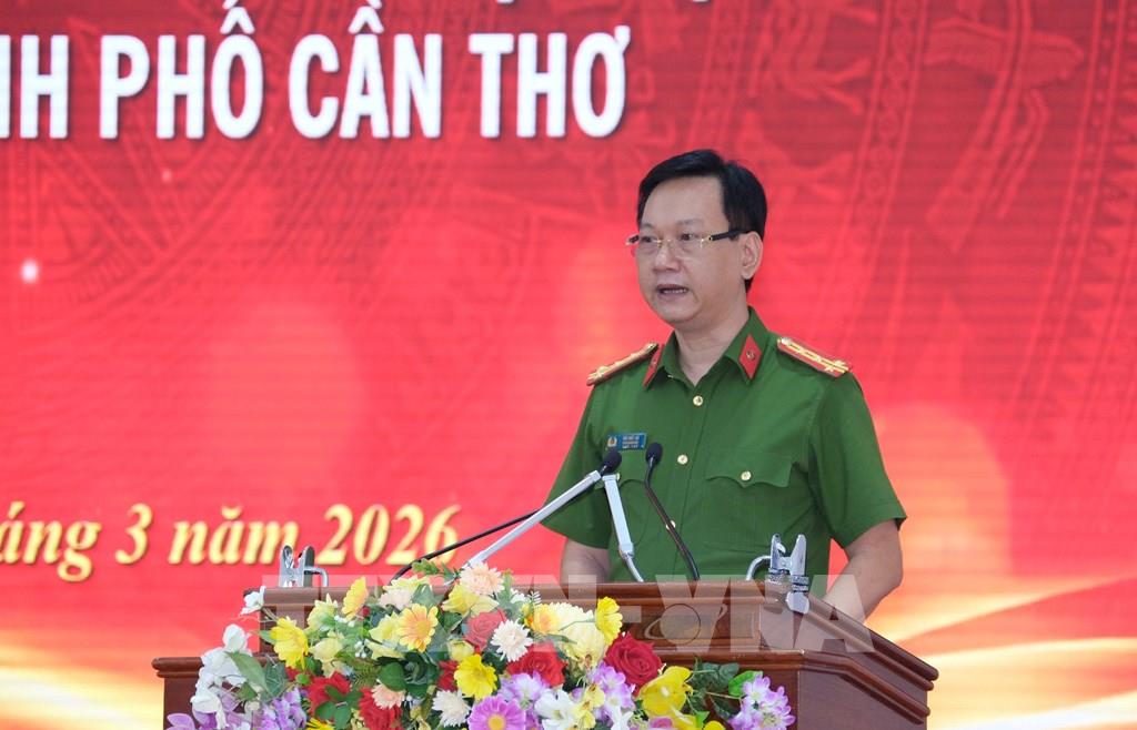 Đại tá Bùi Đức An, Phó Giám đốc Cơ quan Cảnh sát điều tra Công an thành phố Cần Thơ phát biểu tại Hội nghị. Ảnh: Thanh Liêm - TTXVN